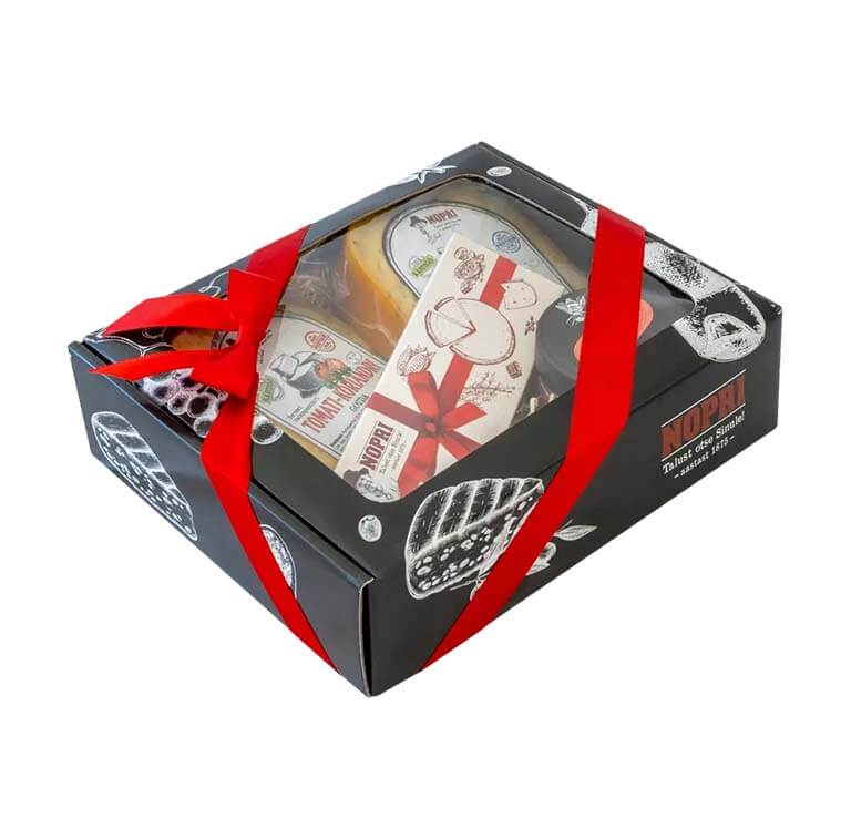 Pakend: kinkekarp, juustud vaakumpakendis, mesi klaaspurgis, šokolaad pappkarbis