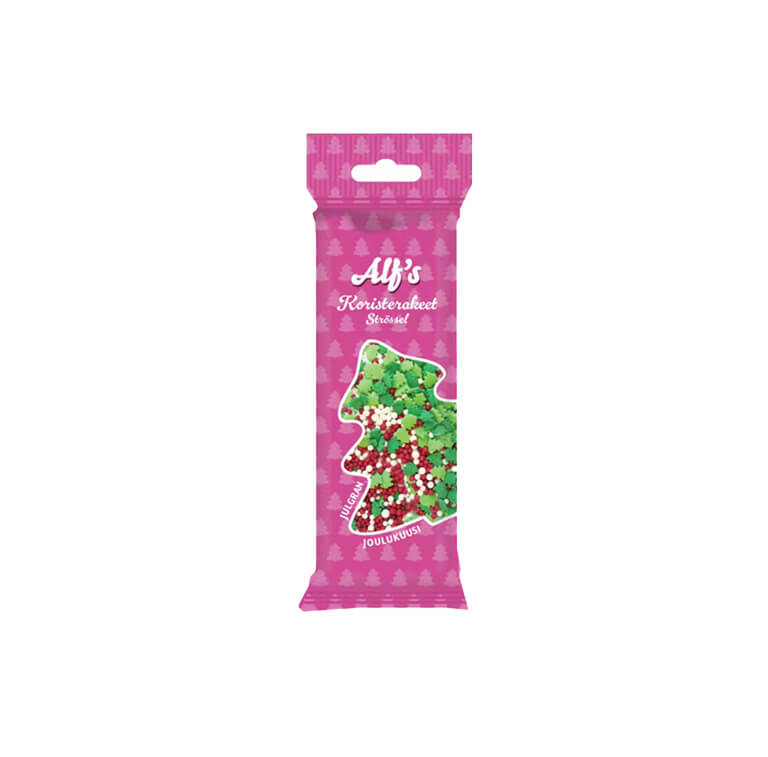 Alf’i jõulupuu suhkrupuiste segu sisaldab rohelisi kuusekujulisi puisteid ning punaseid ja valgeid nonparelle. Need armsad Alf’i puisted ei sobi ainult piparkookide kaunistamiseks, vaid on suurepärased ka küpsetiste, tortide, magustoitude ja jäätise kaunistamiseks.